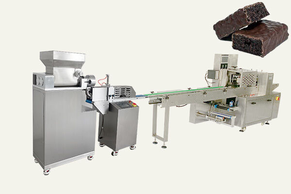 A chocolate coating machine covers bars evenly (dark/milk/white chocolate options).